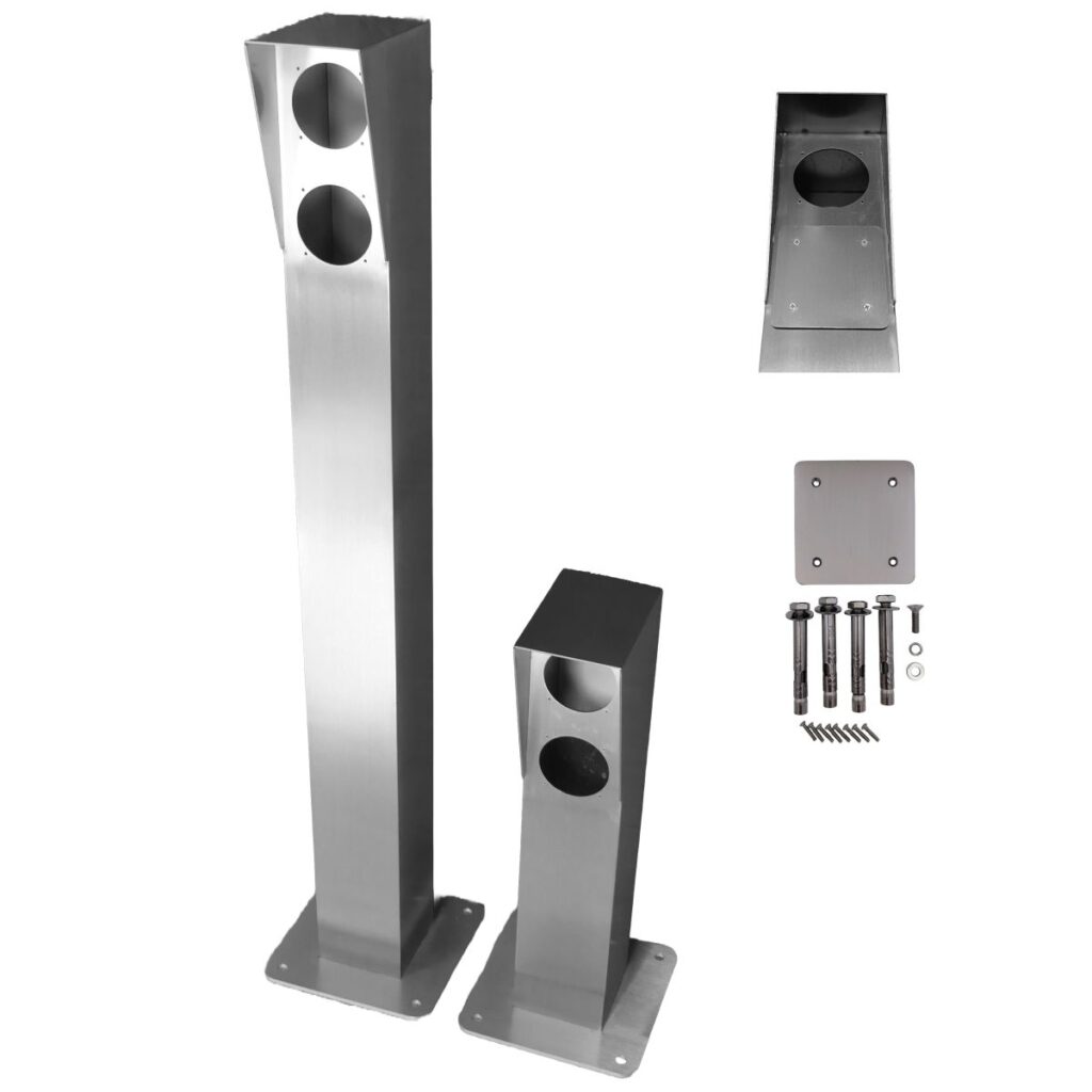 Energiesäule, Anschlusssäule, sehr stabile Ausführung, Höhe 1000 mm, zwei Einbauausschnitte Ø 68 mm für NUP-Dosen, Edelstahlrohr vierkant/quadratisch, rostfrei und wetterfest, Nano-Beschichtung gegen Fingerabdrücke und Verschmutzung, Standfuss/Flansch 200 x 200 x 5 mm mit 4 Bohrungen Ø 11 mm, Gewicht 12.5 kg, Lieferumfang: Säule, Abdeckplatte für einen Ausschnitt inkl. Schrauben, 4 Erdanker, 8 Schrauben M3 zur Fixierung der NUP-Grundplatten, Erdungsschraube